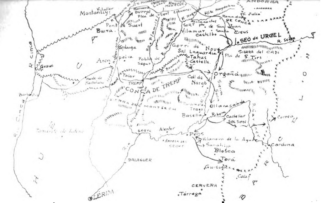 De Pobla de Segur, continuó por el valle de Cabó para llegar hasta Orgañá. Desde esta ciudad, un grupo de expedicionarios descendió por la cuenca del río Segre, llegó hasta Coll de Nargó, y desde allí fue destacado el Tcol Santocildes para ocupar Oliana. Los destacamentos cristinos de Oliana y de Peramola se retiraron a Pons, mientras los destacamentos avanzados carlistas se ubicaban en Tragó y Oliana.