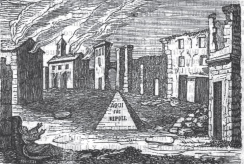 Ya fuera porque deseaba dar un ejemplo que hiciera desistir a cualquier otro lugar de una defensa semejante, ya fuera como venganza hacia una plaza reputada por liberal, lo cierto es que Ripoll fue entregado a las llamas, la destrucción sistemática de todo el pueblo, con asesinatos indiscriminados entre la población civil y la voladura de los dos puentes del siglo XI de la villa, que franqueaban el río Ter y el río Freser y que habían sobrevivido todas las riadas hasta ese día. No faltando quien afirma que, en la más pura tradición de Mina, el conde colocó sobre las ruinas una pequeña pirámide donde podía leer: “Aquí fue Ripoll”.