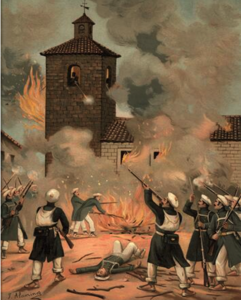 Los del campanario recibían pedradas lanzadas con ondas y también las tentadoras ofertas que les hacían los carlistas a los que en otro tiempo habían sido compañeros; llamándolos por sus motes y haciéndoles memoria de convites y francachelas pasadas, como también un padre carlista llamaba por su nombre a su hijo isabelino. Matad al alcalde y bajaos. Pero aquellos hombres estaban decididos a morir.