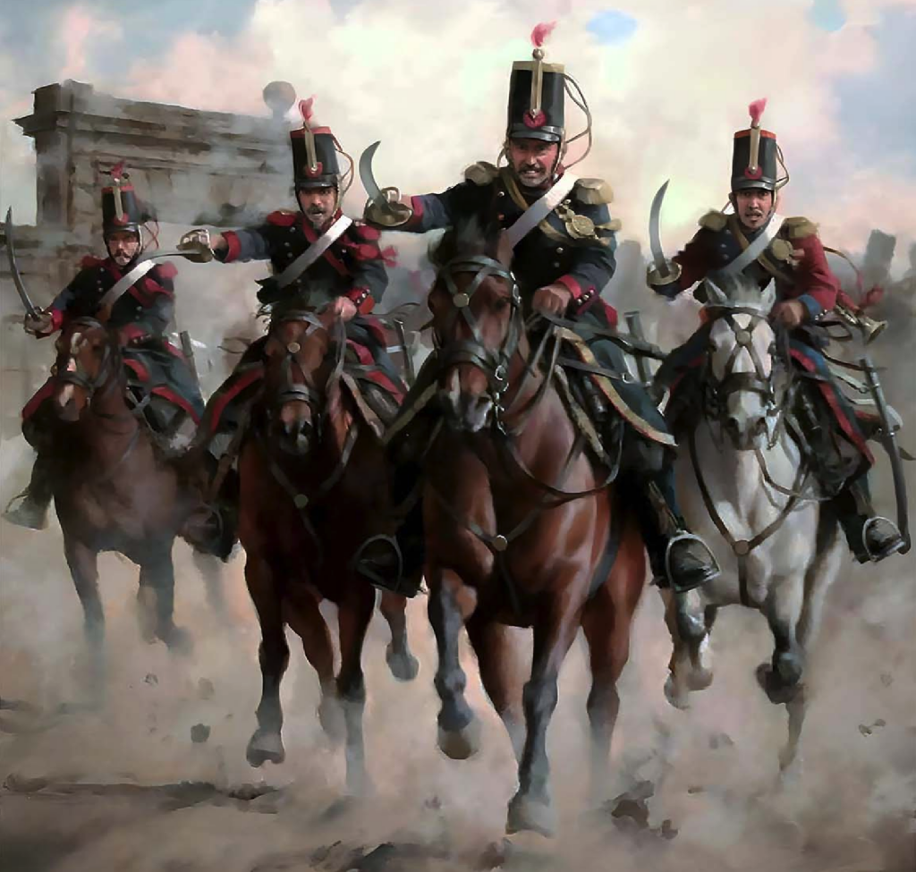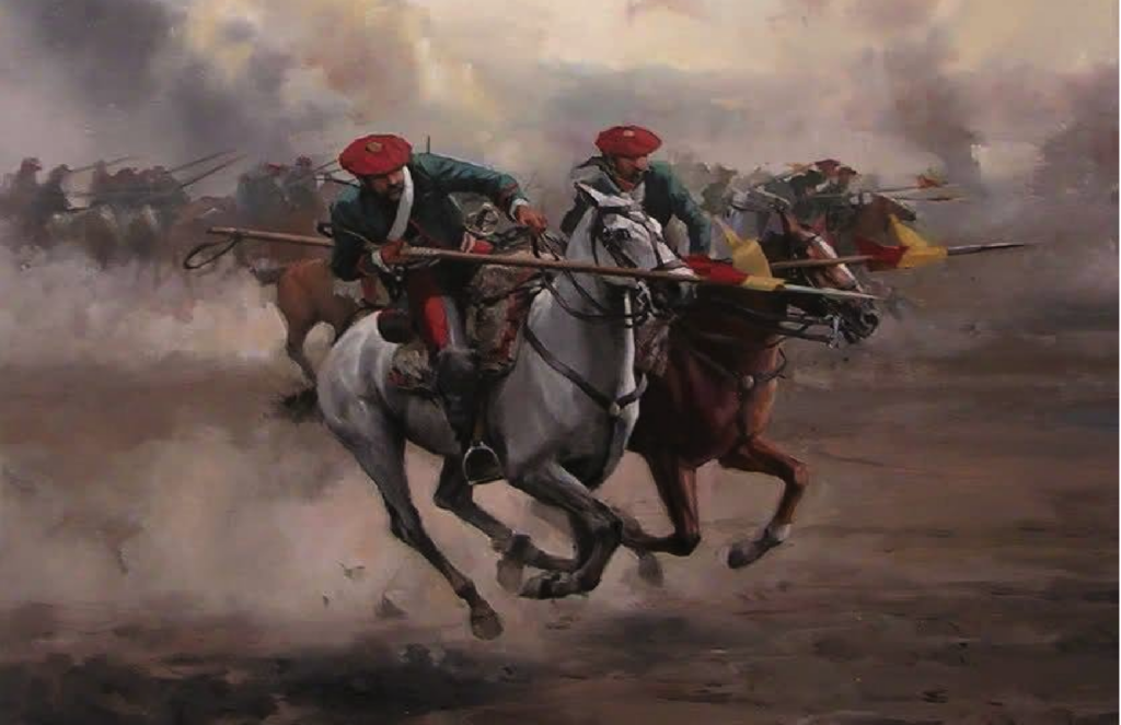 Lanceros carlistas de Aragón. Se distinguen por su cazadora verde sin ribete. Autor Augusto Ferrér Dalmau.