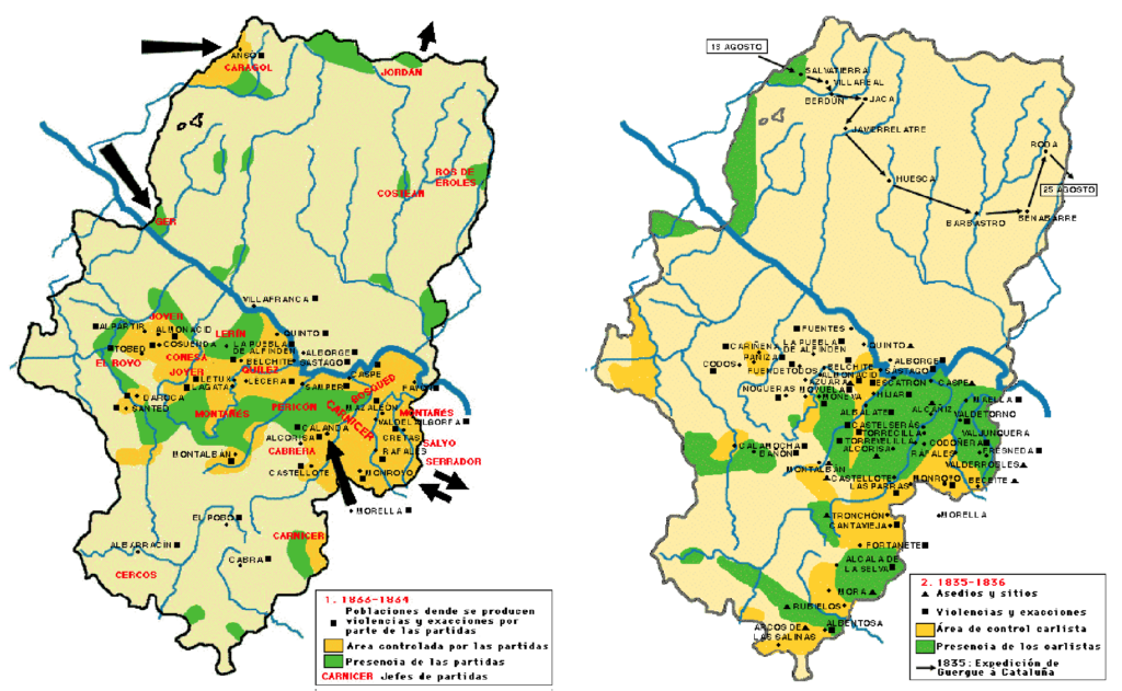 A partir de 1838 la actividad carlista entra en su fase de mayor extensión, no solo por la acción de las fuerzas radicadas en Aragón, sino también por la incidencia que tienen las incursiones que se producen en la franja fronteriza de Huesca con Navarra y siguiendo el curso del río Jalón. Las principales ciudades al sur del Ebro, Calatayud, Zaragoza, Caspe, Alcañiz y Teruel, tienen los carlistas en sus puertas, y el territorio que media entre ellas está fuera del control de las tropas liberales.