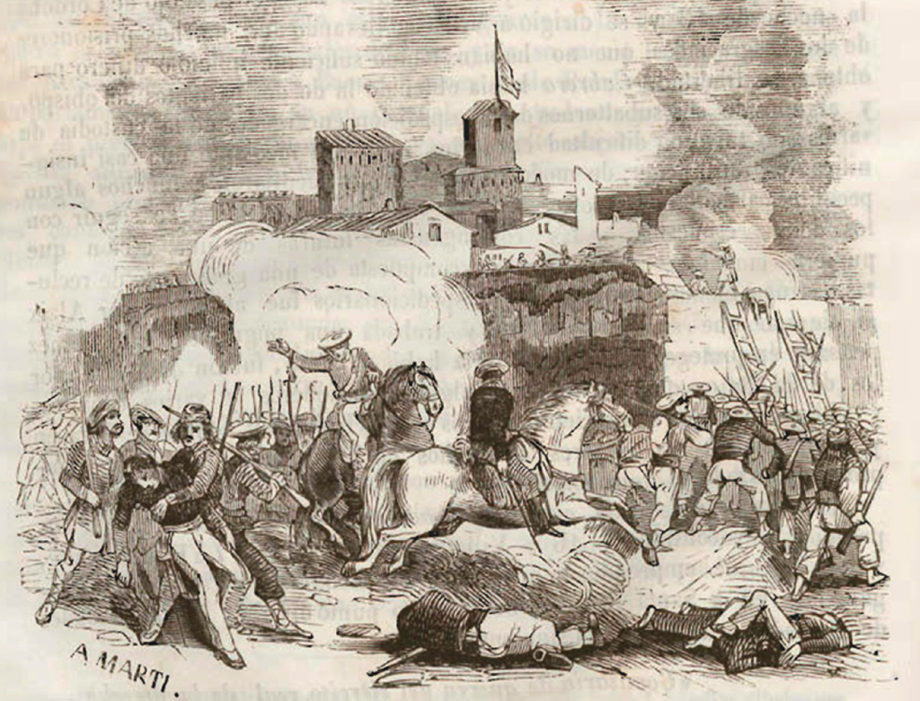 Expedición carlista de Gómez. Los carlistas atacando y tomando Almadén el 23 de octubre de 1836. Autor A. Martí, libro de Dámaso Calbo y Rochina de Castro.