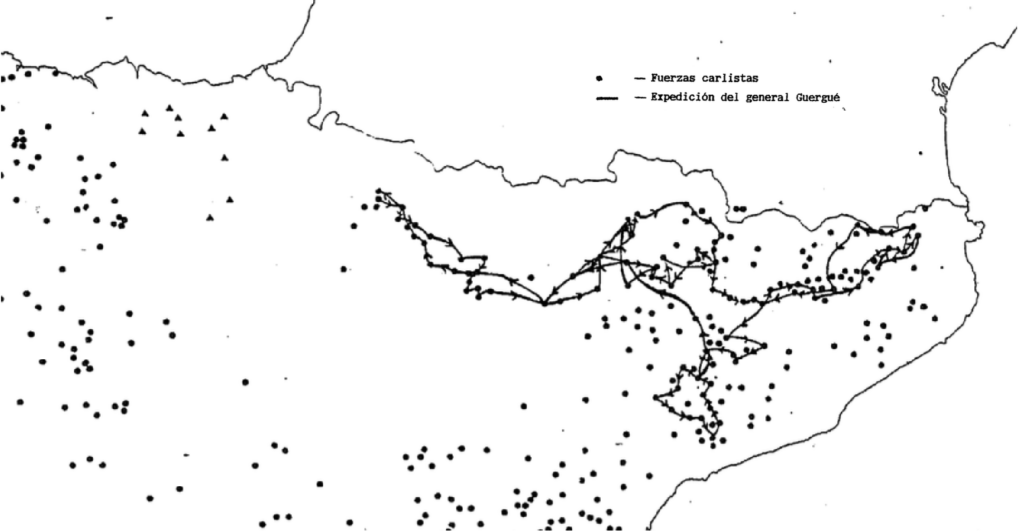Al avance de las fuerzas de Guergué, las guarniciones eran abandonadas y las milicias cristinas huían despavoridas, y donde había una plaza fuerte, allí se encerraban las fuerzas que podían alcanzar sus muros; ninguna columna cristina de tantas como había en Cataluña se interpuso al paso de Guergué; su sola presencia bastaba para que las comarcas enteras se le entregasen.