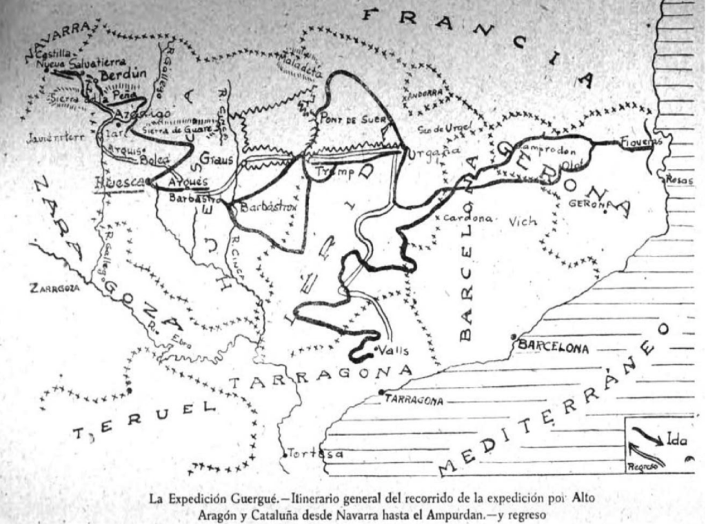En esta última marcha al Pirineo, Guergué maniobró hábilmente para despistar al enemigo. Tomó el rumbo de Castellfullit de la Roca, y de aquí a Besalú, y luego a Lladó. Después de un movimiento de retroceso, pudo cubrirse, deslizándose al abrigo del valle de la Muga, hasta Baget, desde donde podía estar ya a la vista y acecho de los colls de Maltrem, de Pragent y de Vermadell, que parecían los más indicados para que, por uno de ellos, según las circunstancias, entrara el conde de España en tierra catalana. El Conde estaba en Ceret (Francia); había aceptado el mando carlista de Cataluña, a instancias de Carlos V, según carta autógrafa del Rey que le había llevado personalmente el comandante Joaquín Gilde Bernabé.