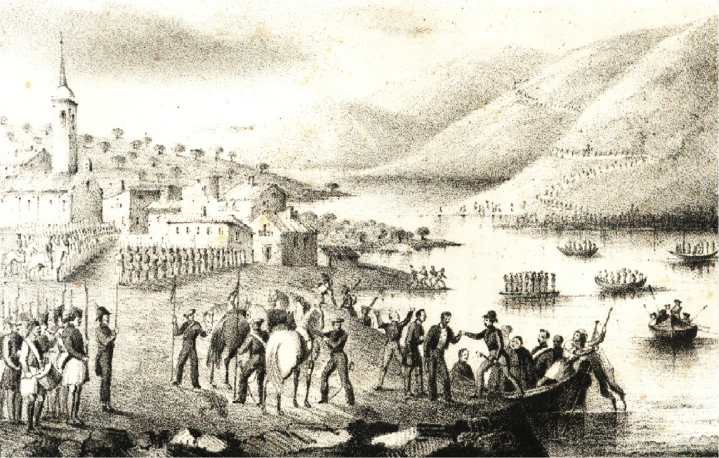 Por él pasó a la orilla izquierda el ejército expedicionario durante los días 16 y 17 de mayo, poniéndose ya entonces de manifiesto la carencia de organización que había de caracterizar a la expedición. No se habían provisto de barcazas suficientemente robustas para soportar el peso de la artillería, por lo que esta tuvo que quedarse en la orilla derecha, partiendo la tropa sin ella en dirección a Aragón.
