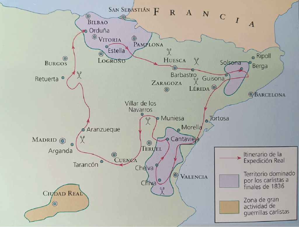 El ejército carlista había obtenido poco antes importantes victorias al rechazar los intentos realizados por las fuerzas cristinas de penetrar en su territorio desde Pamplona, San Sebastián y Bilbao, por lo que la moral de los soldados carlistas era muy alta. Dadas todas estas circunstancias, el mando preparó una nueva expedición que resultó ser la más importante que se llegó a realizar y es conocida como Expedición Real debido a que en ella participó el Pretendiente.