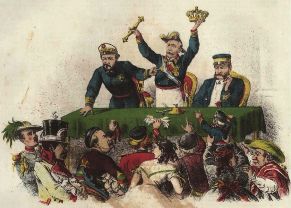 Así, el 31 de octubre de 1870 Amadeo confirmó oficialmente la aceptación de la Corona española. Prim reunió a los tres grupos que apoyaban al gobierno: unionistas, progresistas y “cimbrios”, estos dos últimos fusionados en el Partido Radical, para que apoyaran su propuesta, lo que provocó la ruptura de la Unión Liberal entre los “fronterizos” o “aostistas”, que apoyaron la candidatura, y los que la rechazaron por no haber sido debatida previamente entre los miembros de la coalición gubernamental, encabezados por Antonio de los Ríos Rosas.