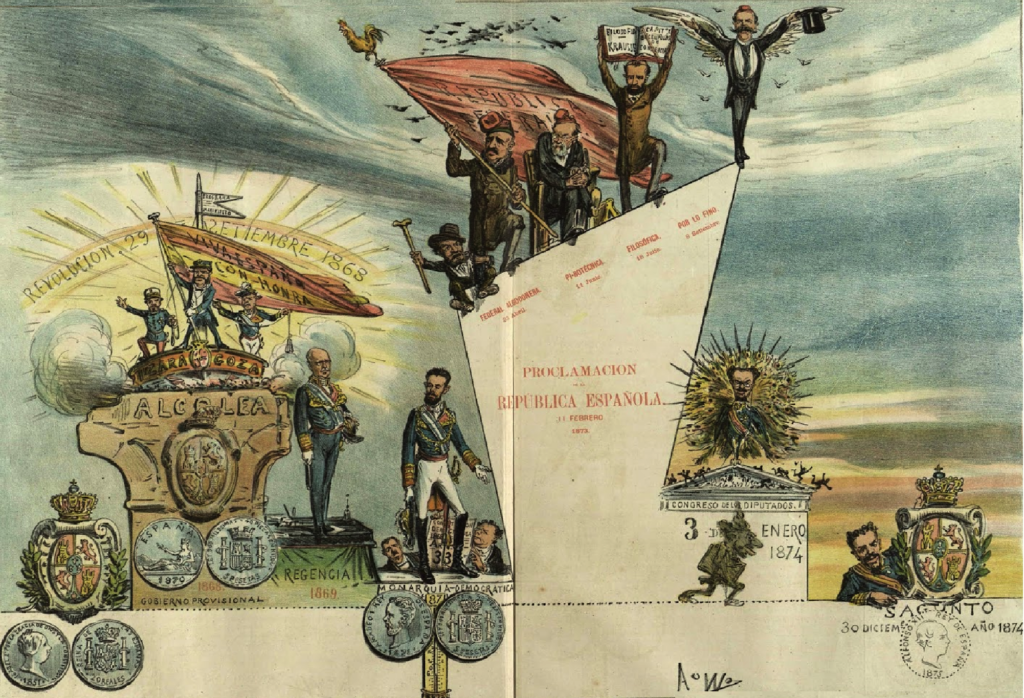 - Primera República Española (1873-84), proclamada tras la renuncia al trono del rey Amadeo de Saboya en febrero de 1873.
