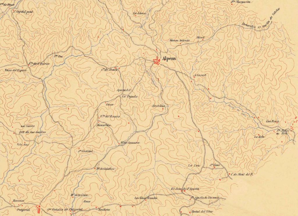 Acción de Alpens (9 y 10 de julio de 1873). Mapa de la zona. Atlas topográfico de la narración militar de la Guerra Carlista de 1869 a 1876.