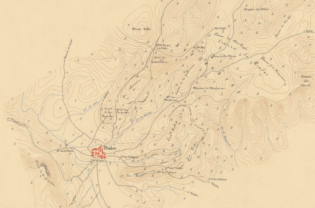 Acción de Prades (19 de octubre de 1873). Mapa de la zona. Atlas topográfico de la narración militar de la Guerra Carlista de 1869 a 1876.