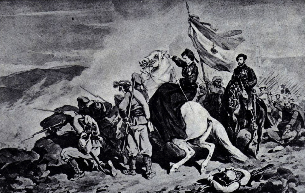 Batalla de Alpens (9 y 10 de julio de 1873). Los infantes doña María de las Nieves de Braganza y don de Alfonso de Borbón. Autor un pintor polaco.