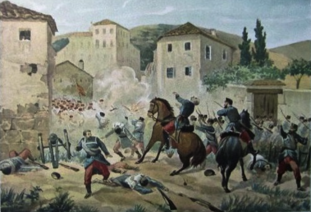 El oficial de intendencia Vicente Reina, que tenía como misión defender un convoy de caudales. La tropa se ve sorprendida por una fuerza carlista mucho más numerosa y se entabló el tiroteo, el ataque a la bayoneta y la lucha cuerpo a cuerpo. El oficial Reina, envuelto por el enemigo, lo desafía, sin más armas que su sable y pecho, mientras los últimos de sus hombres esgrimen el fusil para dar el posterior bayonetazo.