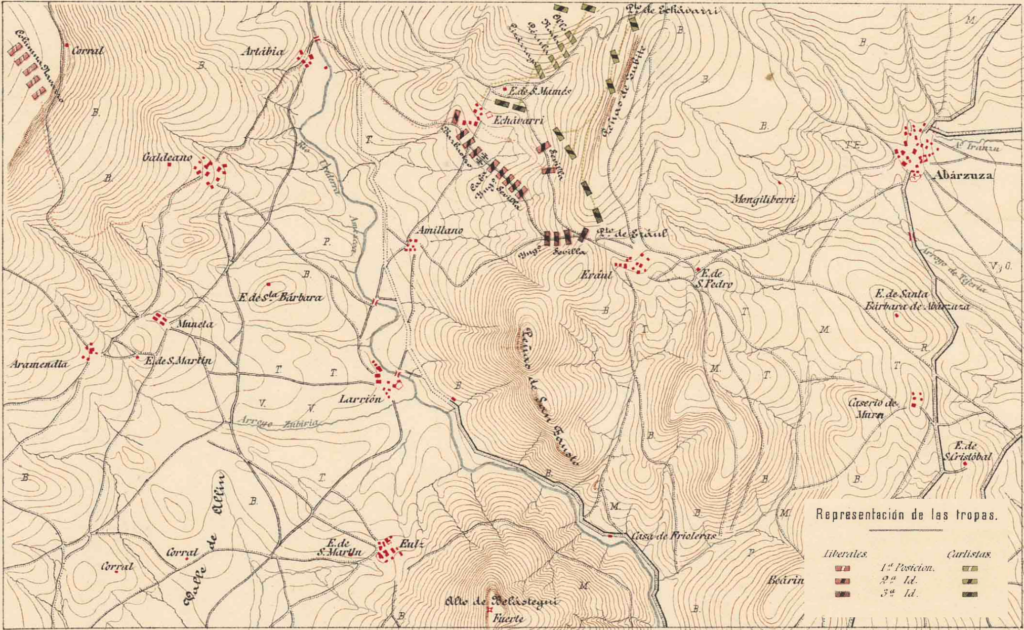 El BI-II y BI-III de Navarra se situaron a retaguardia, para contraatacar en caso de retirada. La caballería se sitúa igualmente sobre la meseta que corona el Zubiti, porque el terreno no permitía, en teoría, su uso. Todos los cronistas, tanto liberales como carlistas, valoran lo inexpugnable de la posición en la que se situaron las tropas carlistas. Posiciones de difícil flanqueo, y que obligaban al atacante a tomarlas mediante un avance frontal, ascendiendo necesariamente por una ladera quebrada y boscosa.