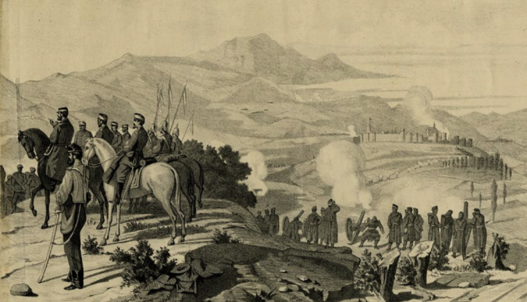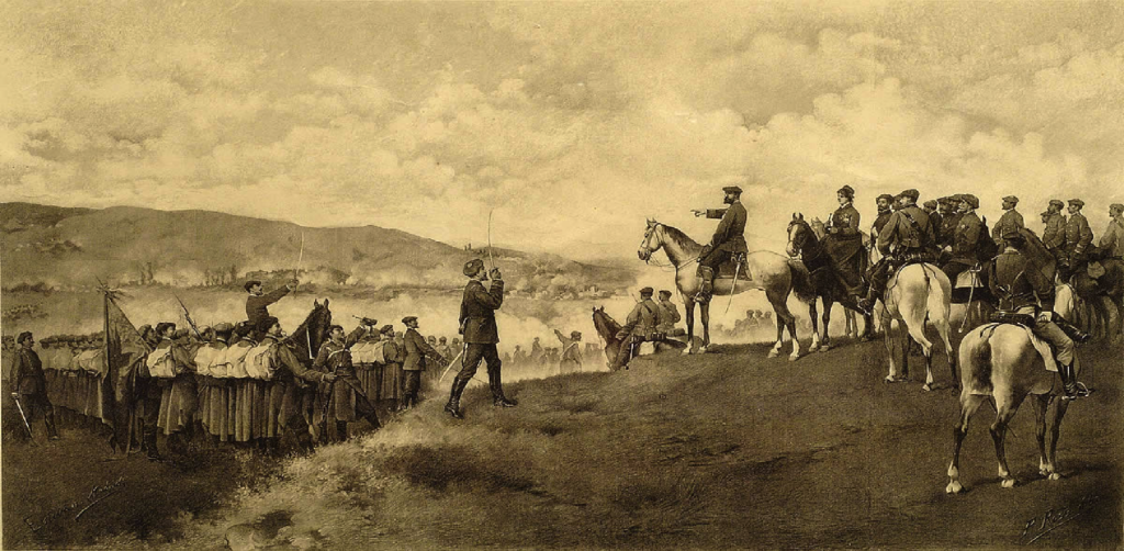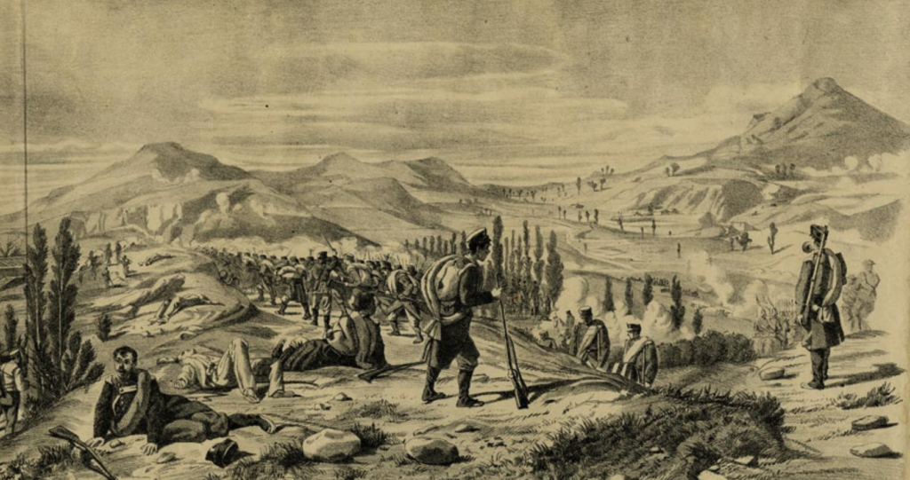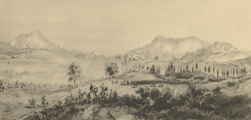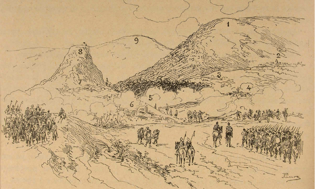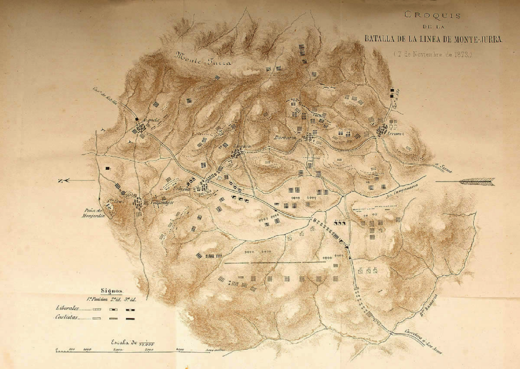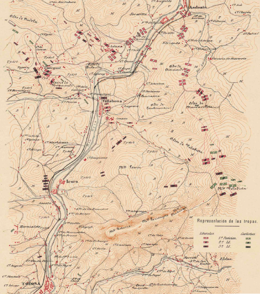 Al llegar al alto del monte los batallones navarros, en cuya subida no tardaron menos de dos horas, ya se había roto el fuego en las posiciones del general carlista Lizárraga, y con el auxilio de los prismáticos pudimos ver que sus fuerzas marchaban en retirada, replegándose de cañada en cañada y de monte en monte sobre Asteasu, Larraul y Alquiza. El fuego era muy débil, a veces, por parte de los carlistas, lo cual hizo suponer cuál pudiera ser la verdadera causa, que no era otra sino la escasez de cartuchos y la relativa desorganización en que habían quedado los batallones guipuzcoanos por la incalificable conducta del cura Santa Cruz.