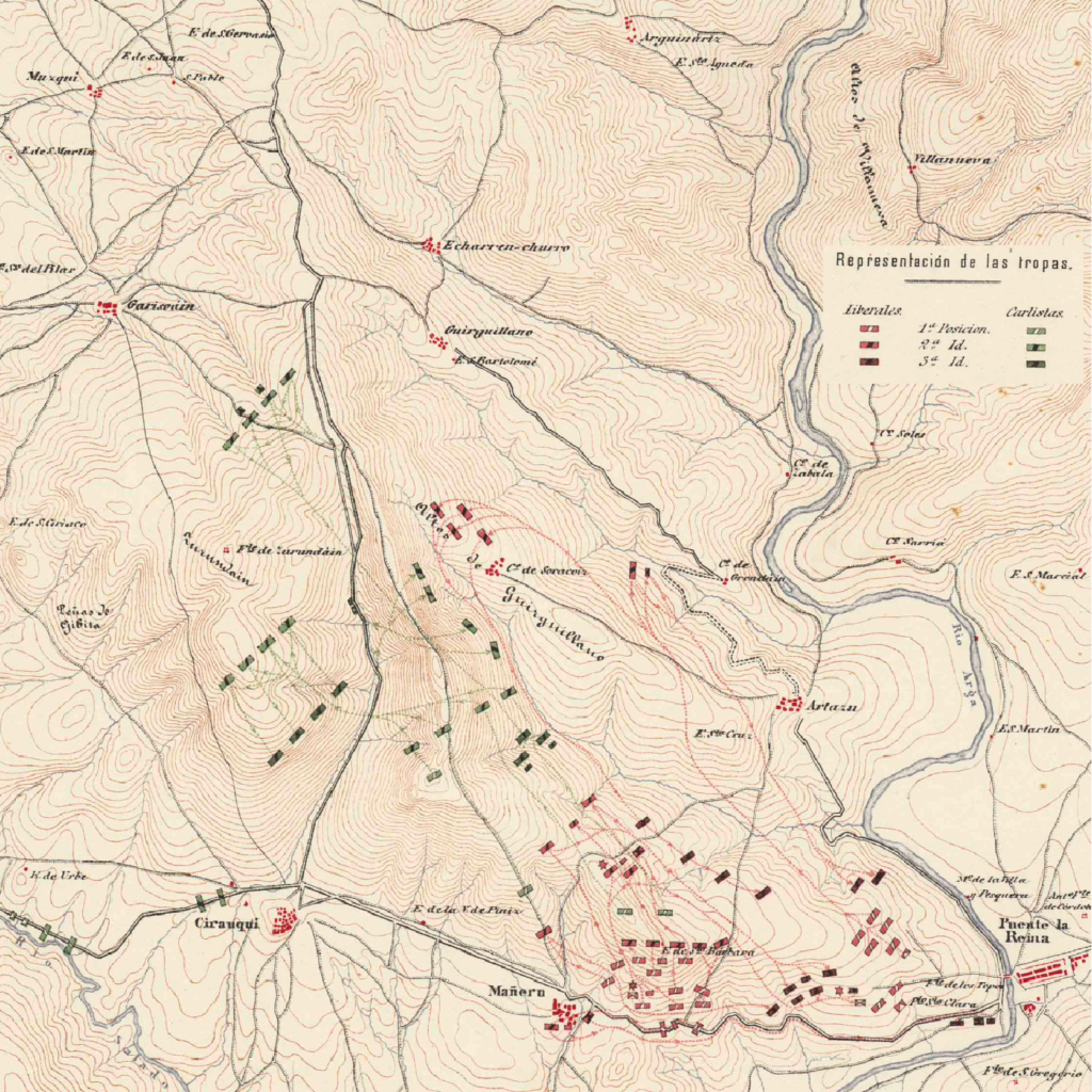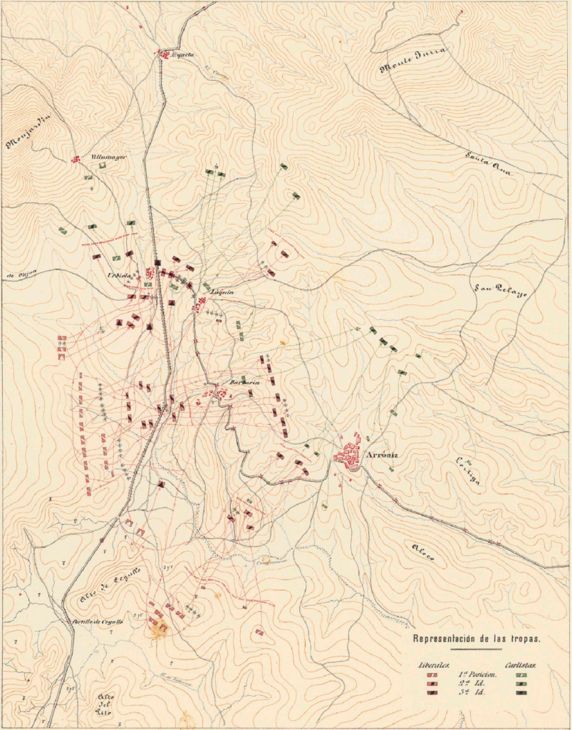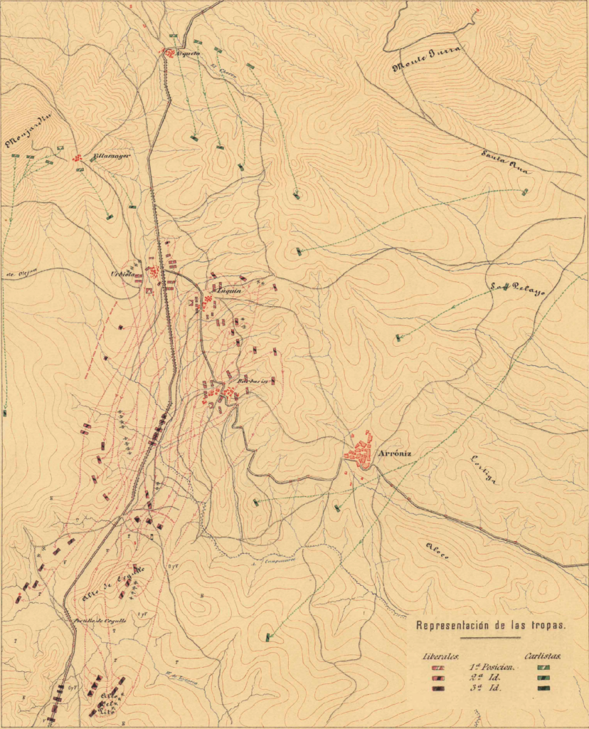 Le tocó a la división de Navarra ocupar la extrema derecha; a los alaveses y vizcaínos, el centro; y a los guipuzcoanos, la izquierda, cuyas fuerzas todas, bajo el mando parcial de sus respectivos comandantes generales Olio, Larramendi, Velasco y Lizárraga, se hallaban a las órdenes del jefe del Estado Mayor General Elío y del capitán general de las provincias vasco-navarras Dorregaray.