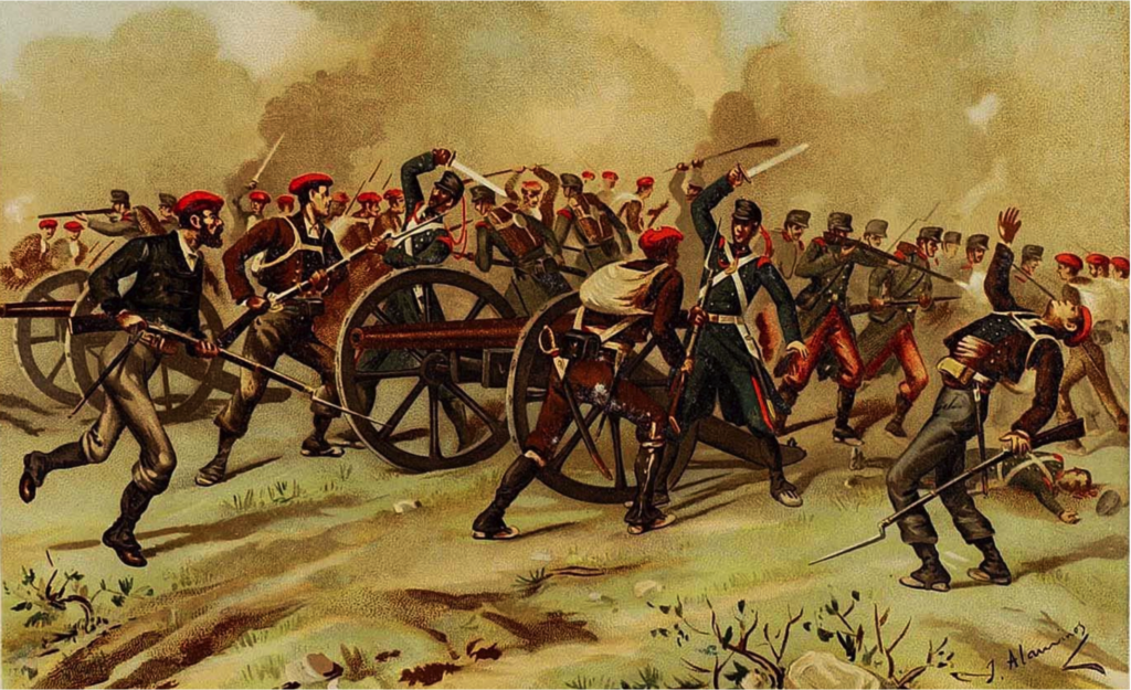 Entretanto el brigadier Weyler dominaba las mesetas de la izquierda, a donde subió la artillería de montaña con rapidez, a pesar de lo escarpado de la pendiente, y allí se encontró con las facciones que en crecido número ocupaban una extensa línea, y que, apoyados en algunos caseríos y cercas de piedra, presentaron el combate, parapetados en las referidas defensas.