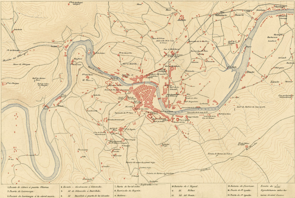 Los carlistas, en cambio, careciendo de bocas de fuego, pues los 2×12 únicos cañones lisos de bronce los tenía a sus órdenes el brigadier Patero, en Algorta, hubieron de desenterrar algunos de hierro de a 12 y 13 centímetros, lisos también, y que habían servido en los muelles para amarrar los cables de los barcos. En atención a la falta de buena artillería, elemento indispensable para sitiar plazas, se decidió en consejo de guerra presidido por Carlos VII y al que asistieron los generales marqués de Valde-Espina, Planas y Benavides y los brigadieres Maestre e Iparraguirre, que los morteros fuesen el elemento principal del ataque, por la de creer que Bilbao se entregaría al recibir las primeras bombas y ver interrumpido su tráfico con el extranjero.
