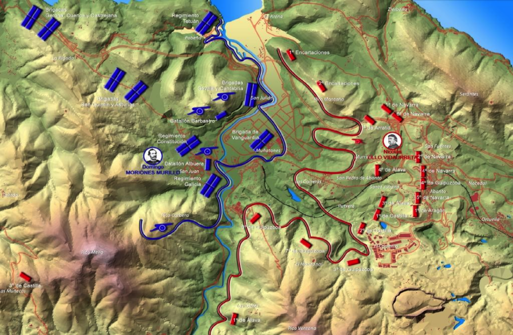 El general Moriones, después de la reunión de sus fuerzas en la zona de Castro Urdiales, reorganizó el Ejército de Maniobra en una brigada de vanguardia al mando del brigadier Blanco, tres divisiones, de a dos brigadas cada una (DI-I de Primo de Rivera, DI-2 de Andía y DI-3 de Catalán), una brigada de caballería al mando de Jaquetot, 3 baterías Krupp, 3 baterías de montaña, compañías de ingenieros, guardias civiles y carabineros. Con un total de 27 batallones, 5 regimientos de caballería y unas 30 piezas de artillería, que debían forzar la línea carlista y, después de aniquilar al ejército real, salvar a Bilbao. Se dispuso que la Flota republicana apoyaría con sus fuegos las operaciones en el ala izquierda. Todo estaba preparado para acabar con la guerra carlista.
