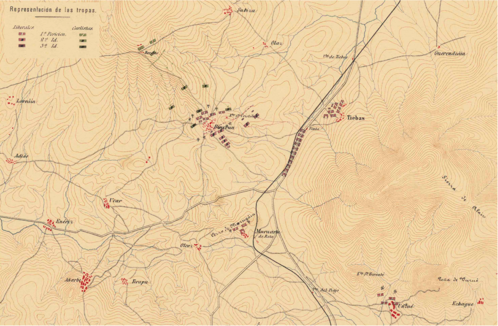Al llegar a dos kilómetros de Oteiza, vio que Mendiri había fortificado y atrincherado el pueblo, una posición dominante de su derecha, y que a su izquierda, en el Monte Esquinza, se habían colocado y atrincherado algunos batallones con artillería.