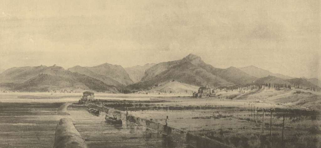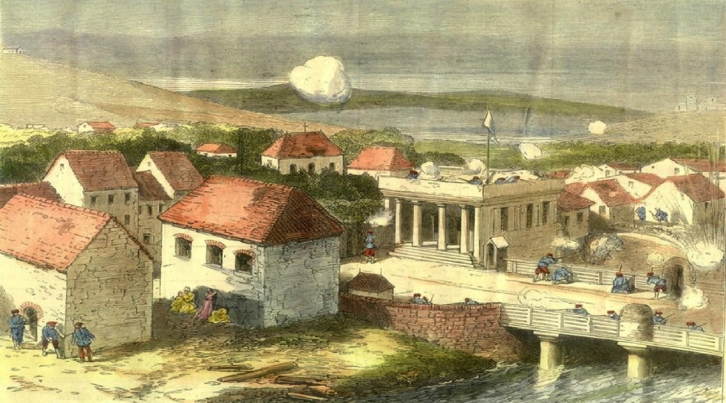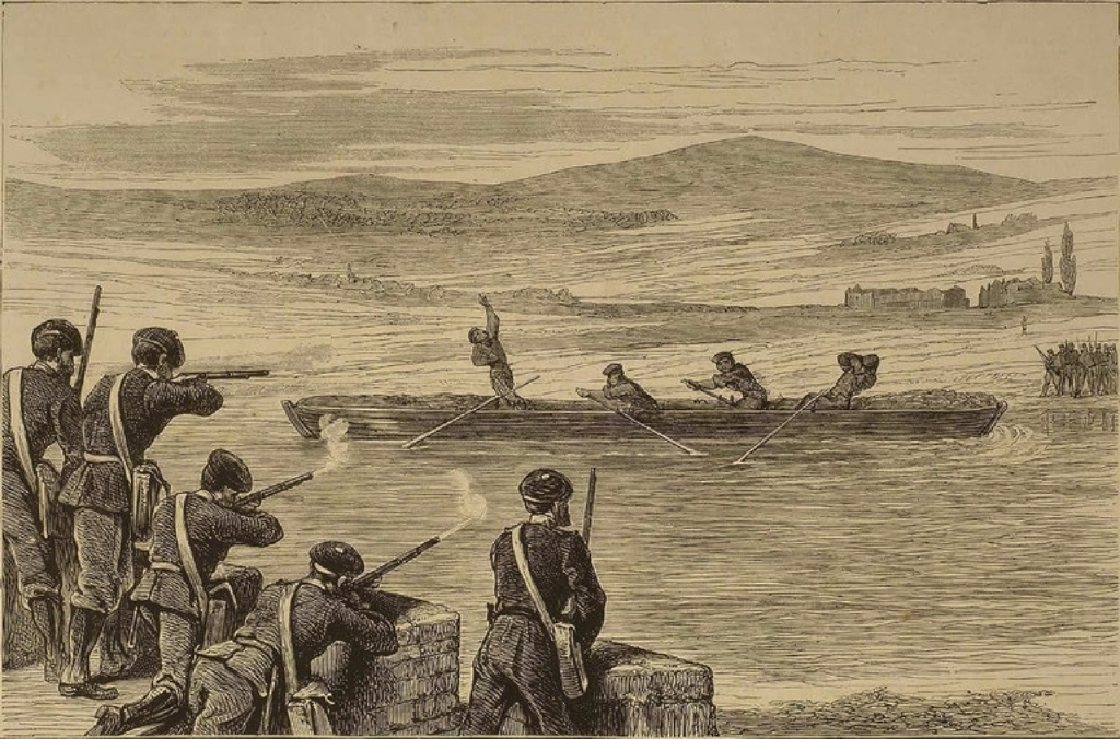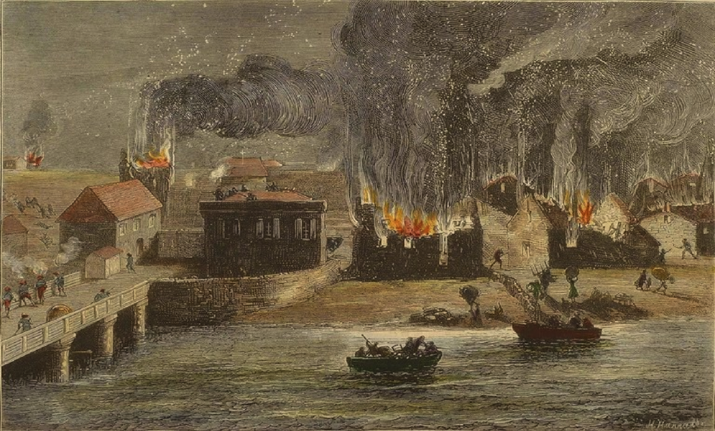 «Bayona, 15 de octubre. (…) Ataque a la casa fortificada de la Aduana cuando había una densa niebla que cubría el Bidasoa. Los carlistas, unos 1.500, avanzaron hasta las casas contiguas al río; luego, haciendo agujeros de una casa a otra, llegaron hasta la cabecera del puente, bordeando la Aduana y el puesto de cincuenta hombres antes de que se diera la voz de alarma. Poco después de levantarse el alba, cuando la alarma se extendió, una intensa descarga de mosquetería despertó a actores y espectadores. La guarnición francesa, en la orilla contraria, tomó las armas. Los carlistas avanzaban de casa en casa, protegidos por las paredes, y los republicanos ocultos, los dos partidos disparándose, sin verse. El cañón de Irún se interpuso entonces, pero sin mayores consecuencias, pues a pesar de los proyectiles que podían llegar, los carlistas seguían detrás de sus refugios. Al final, la guarnición de Irun llegó a apoyar al fuerte de la aduana. Veinticinco miqueletes hicieron una carga de bayoneta; los vieron subir como gatos por las crucerías de las casas, y salir con las manos teñidas de sangre. Los carlistas huyen ante este puñado de hombres. Por la tarde todo había terminado. Sin embargo, el cañón de Irún seguía disparando y varios obuses cayeron en Francia, matando a un soldado e hiriendo a una mujer en un brazo. Mi boceto representa al pueblo en llamas. Nada más entrar, los miqueletes le prendieron fuego, empleando el petróleo que los carlistas usaron en el incendio de la Aduana y que abandonaron en su huida. Dicen que varios vecinos han encontrado la muerte en ese brasero. Era un espectáculo tan sombrío como espantoso y pintoresco al mismo tiempo».