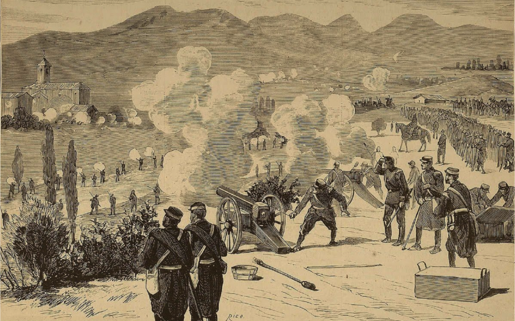 Los republicanos, aprovechándose de los accidentes del terreno y de que los carlistas atacaban en compactas masas, rompieron con gran precisión y serenidad un nutrido fuego de cañón y fusil, que hizo vacilar algo a los carlistas, conteniendo su ímpetu. Parapetada y disparando al abrigo de las tapias del cementerio, que había aspillerado convenientemente, se debió sin duda el éxito de la resistencia a la artillería liberal, solo comparable a la valiente y ordenada acometida de los carlistas.