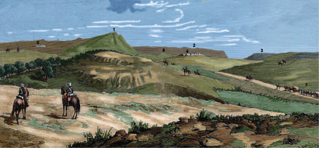 Acción de Santa Bárbara de Oteiza (18 febrero de 1876). Vista panorámica del campo: 1 Montejurra, 2 montañas de las Amézcoas, 3 Monte Esquinza, 4 villa de Oteiza, 5 población de Dicastillo, 6 fuerte de Santa Bárbara, 7 vonvoy de Larraga a Oteiza. Fuente Revista Ilustración Española y Americana.