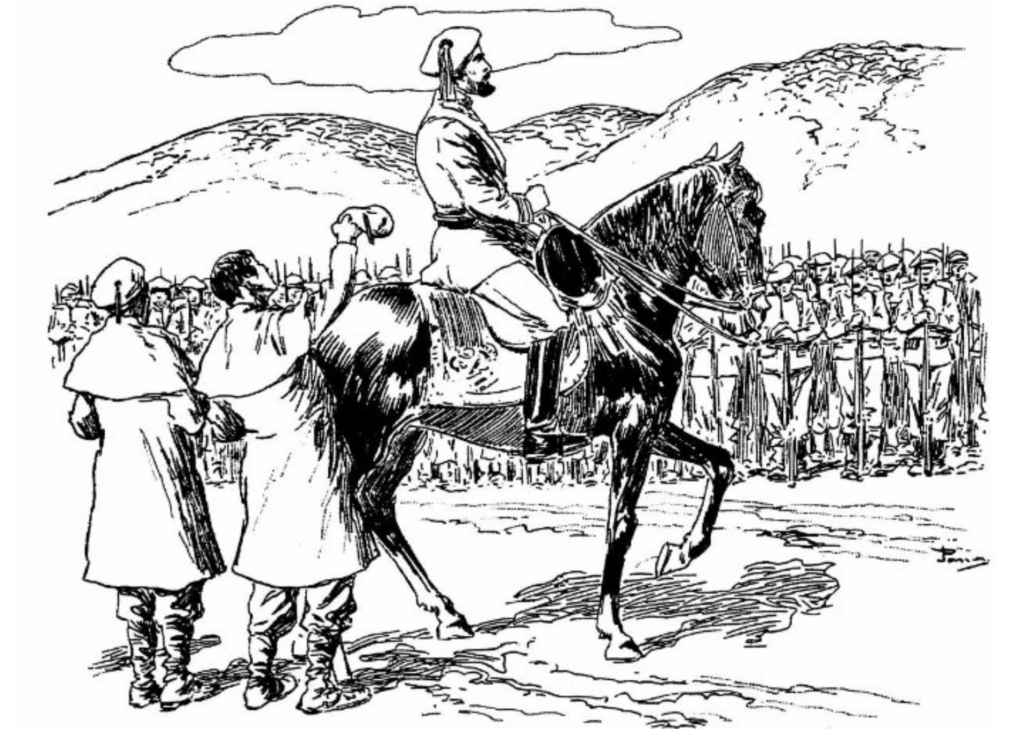 Carlos VII se despidiéndose de sus seguidores en Valcarlos el 28 de febrero de 1876 y dirigiéndose a la frontera. Autor J. Vehil.