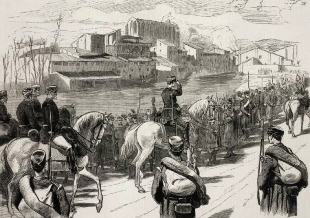 Entrada del rey Alfonso XII en Estella, al final de la Tercera Guerra carlista. Revista The Graphic.