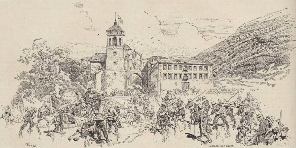Segunda Batalla de Montejurra (17 y 18 de febrero de 1876). Los carlistas heridos son transportados al hospital de Irache el día 17. Autor Daniel Urrabieta Vierge, en la revista Le Monde Illustré.