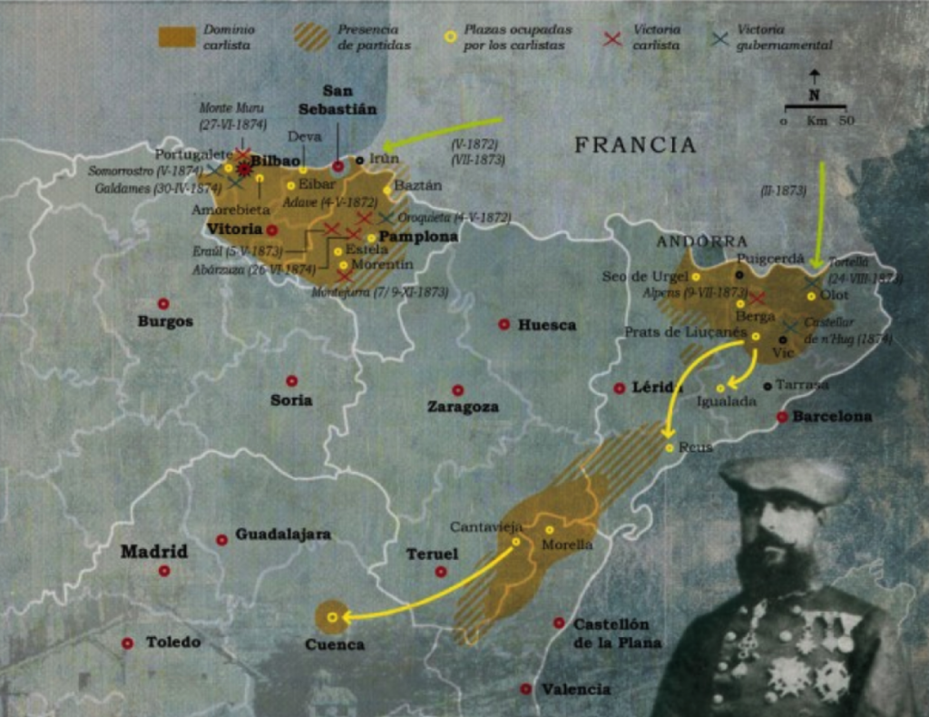 El ejército carlista estaba compuesto, sobre poco más o menos, de la misma fuerza que tenía ya desde el año anterior, operaba generalmente en la siguiente forma: ocho batallones vizcaínos, dos castellanos, el asturiano y algún cántabro, en las líneas de Bilbao y Valmaseda; ocho batallones guipuzcoanos, en la línea del río Oria, San Sebastián y Hernani; dos o tres batallones alaveses por las inmediaciones de Miranda de Ebro y Vitoria, y el resto de los batallones de Álava, de Castilla y de Cantabria, con los 12 navarros, en Navarra.