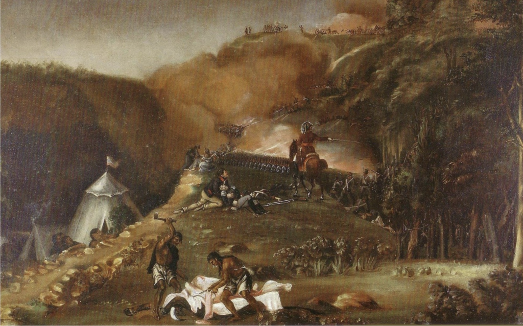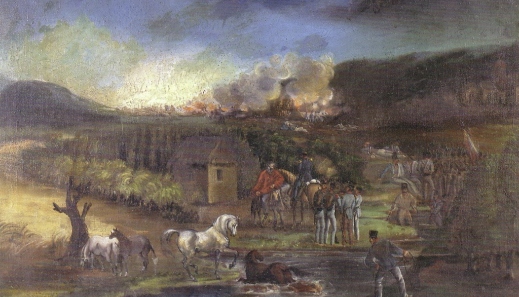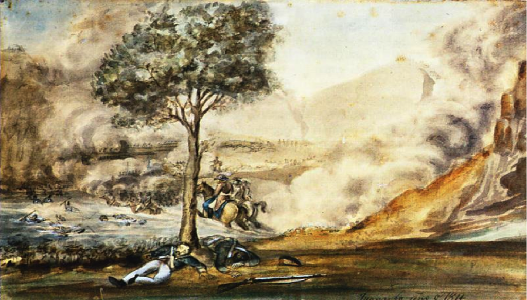 Dice Aymerich “A las 8 de la mañana del 28, con el mayor apuro dan parte del destacamento de Santa María, que los enemigos tratan de atravesar el río en número de 500 a 600 hombres, y piden refuerzos: Sin pérdida de momento previno el general al comandante Ramón Sambrano, siga con su compañía á unirse a aquel destacamento. En el acto mandó lo propio al comandante Juan María de Villota, que marche con su compañía y la del subteniente Martín Cabrejas, que entre todos forman una columna de más de 150 hombres, y con ella se cree contener los progresos de los enemigos. A las 11 de este día rompieron el fuego las baterías altas de los insurgentes que son a nuestro frente para proteger el paso á sus tropas que iban desfilando sobre el vado de las bateas, cuyo intento trató de impedirlo nuestra artillería y fue en vano, porque siempre lo realizaron con intrepidez despreciando el riesgo, y dejando atrás los nuestros que iban teniendo: Luego que todos salvaron este peligroso paso fueron desfilando sobre las baterías bajas de nuestro centro a las que se arrojaban con intrepidez, á pesar del vivo fuego que recibían, las que coronaron obligándonos a dejarlas, y replegarnos á la batería grande que a prevención se había construido a la espalda de dicho campamento: En esta se hicieron firmes los nuestros, a quienes iban flanqueando por la izquierda los enemigos, al propio tiempo que acometían por todo el frente: Visto esto por nuestro general, y que algunos se iban ya dispersando por las cuchillas de la espalda, comenzó a auxiliarlos progresivamente con los 130 morlacos que únicamente le habían quedado a la derecha. Aquí se empeñó más la acción: los del costado izquierdo del boquerón auxiliaron con los que pudieron para acometer por la espalda a los invasores que notando la resistencia se intimidaron, y a las 5 de la tarde emprendieron una precipitada retirada. En el instante que nuestros valientes guerreros advirtieron el fruto de su firmeza en el parapeto a que se habían acogido, lo dejaron para perseguir a los bandidos que ya no buscaban vado para atravesar el río: al que se arrojaban por donde podían, produciéndoles esta ofuscación muchos ahogados. Los nuestros habían también echándose tras ellos hasta la otra banda; pero lo impidieron dos violentos que en el labio inferior tenían colocados, y nos arrojaban metralla en alternativa, y a beneficio de este tiroteo merecieron entrar en su campo después de las oraciones en que cesó el vivo fuego de estas seis horas. El fruto de esta acción es incalculable aunque no debe bajar de 200 hombres entre muertos en 21 cambio de batalla, que estaba cubierto de cadáveres, ahogados en el río, y prisioneros. De los primeros tuvieron como 3 o 4 oficiales, y de los terceros 2, y es regular sea crecido el número de heridos porque muchos de los prisioneros lo están. Deben haber perdido 150 fusiles de que hemos tomado unos pocos, otros rotos de intento cuando huían, y la mayor parte sepultados en el río. Nuestra pérdida ha consistido en el cadete Felipe Soto y 3 soldados muertos; el teniente coronel Don Antonio Mingues con 20 individuos más de la tropa heridos.”