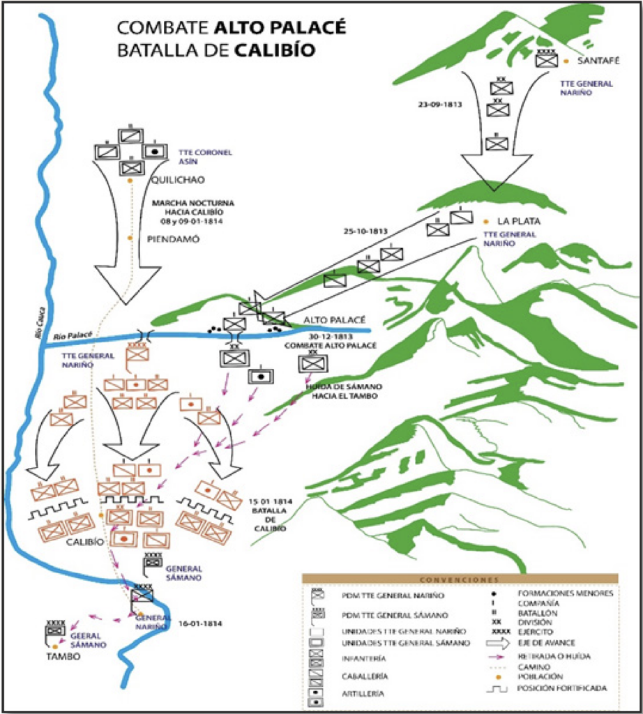 El 15 de enero de 1814, el ejército de Nariño llegó a la hacienda de Calibío, en las inmediaciones de Papayán, donde estaban los realistas con unos 2.200 efectivos y 10 piezas de artillería, mandados por Juan de Sámano e Ignacio de Asín. Mariño disponía de 2.000 efectivos y 15 cañones; dividió su fuerza en tres batallones, uno mandado por el mismo Nariño y el otro por el coronel Leyva, mientras que el otro llegaría momentos más tarde. Se libró una batalla de más de tres horas en la que Asín fue muerto. La descripción de la batalla la hace el boletín n.º 71: