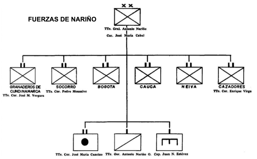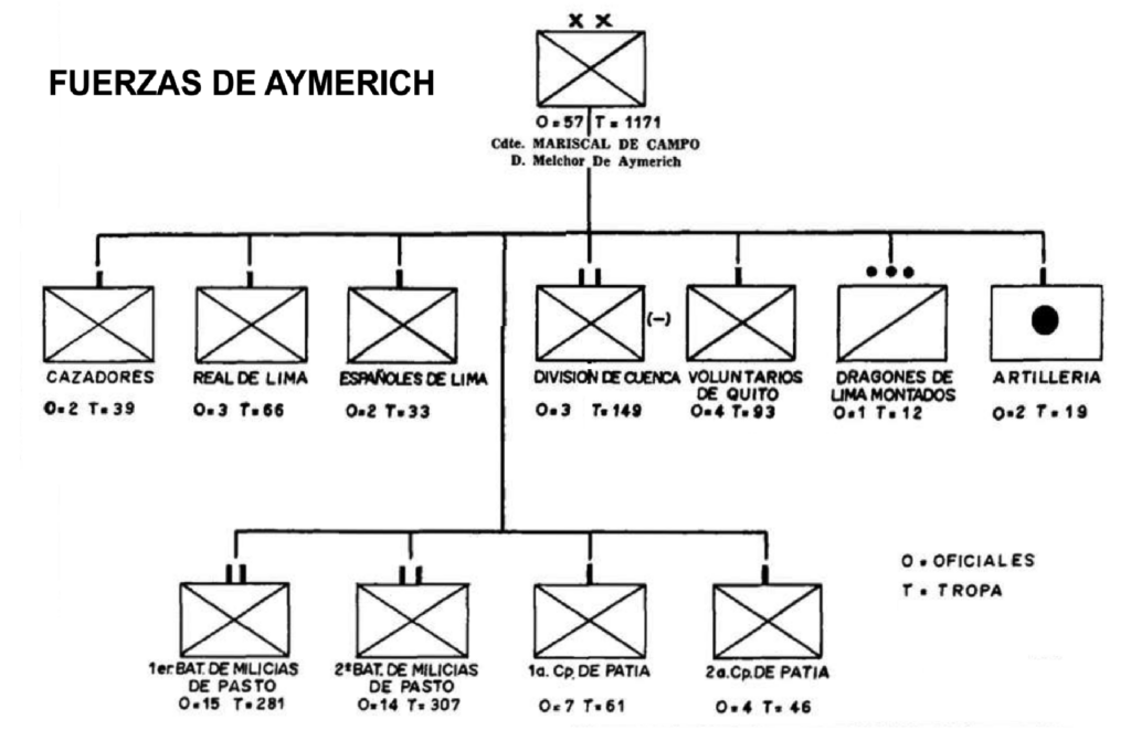 - Segunda División, al mando del Tcol Francisco Soriano con: Cía de españoles de Lima, Cía-2 de Cuenca, Cía-2 de Pasto, Cía-3 de Patía, 2 piezas de artillería.