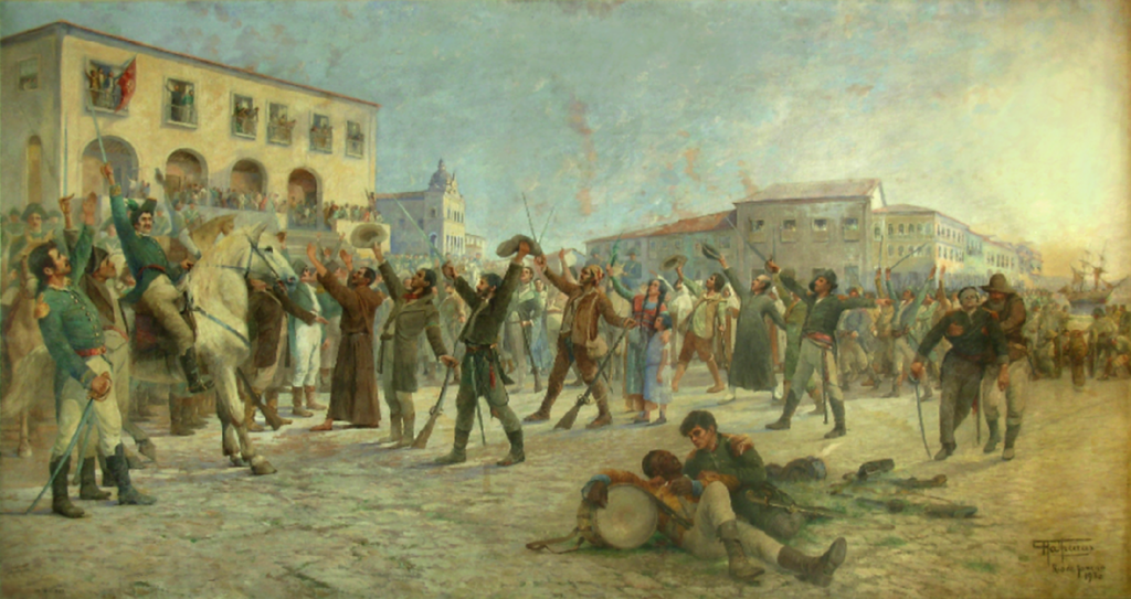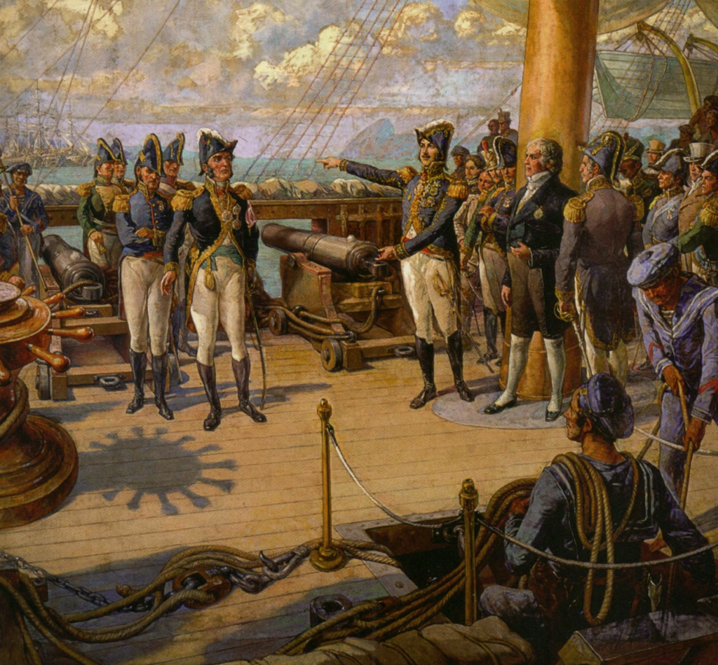 El príncipe Pedro ordena al oficial portugués Jorge Avilez que regrese a Portugal tras su fallida rebelión. José Bonifacio se ve junto al príncipe. Autor Oscar Pereira da Silva.