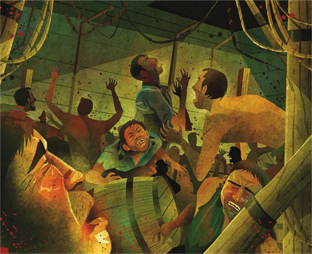 Confinados en la bodega del barco, con las escotillas cerradas y solamente una pequeña abertura abierta para que entrara el aire, debido al hacinamiento y al calor a bordo, los prisioneros comenzaron a gritar pidiendo agua y más aire, llegando algunos incluso a amenazar a la tripulación en su desesperación. Al arrojar agua del río a los presos en una tina en el sótano, la agitación por la disputa se agravó, renovando las protestas de los presos.