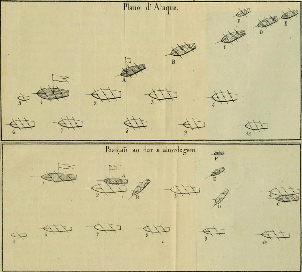 Batalla naval Cabo de San Vicente (5 de junio de 1833). Fuerzas miguelistas. 1 Don Juan (80), 2 Reina (74), 3 Martín Freitas (48), 4 Princesa Real (56), 5 Activa, 6 Isabel María (24), 7 Tejo (20), 8 Princesa Real (22), 9 Audaz (18),10 Sybille (26). Fuerzas pedristas: A Reina de Portugal (46), B Don Pedro (48), C Doña María (42), D Portuense (20), Villa Flor (18), y Faro (6).