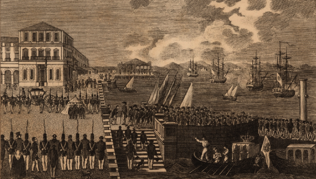 Embarque de la reina Carlota Joaquina para ser trasladada a Lisboa con sus hijas. Autor Jean-Baptiste Debret.