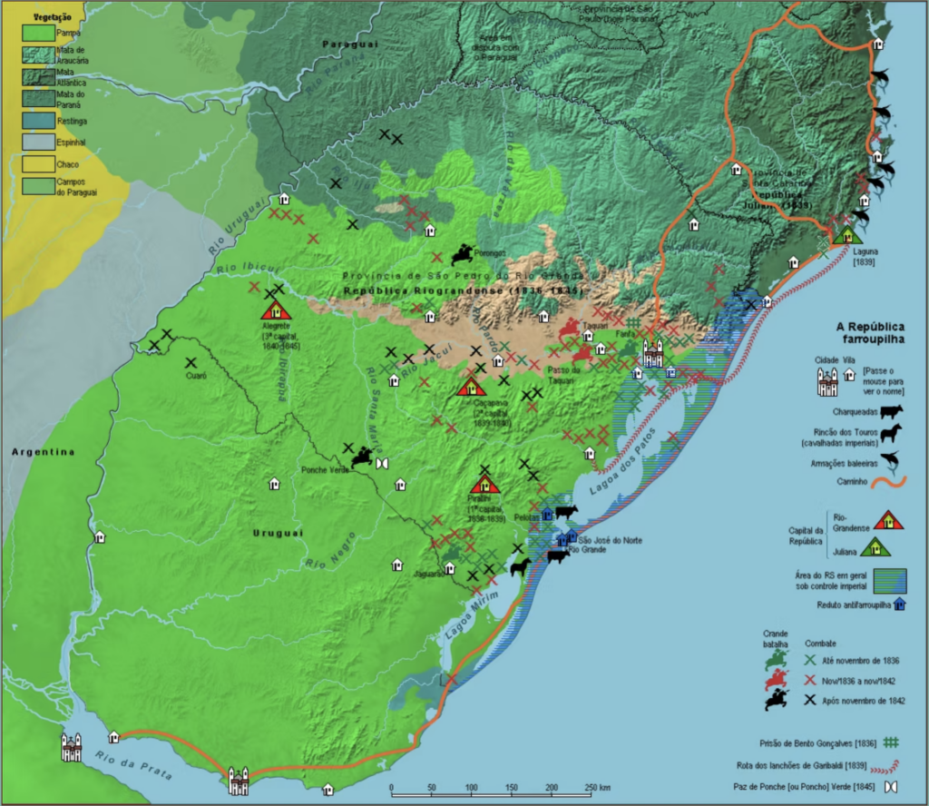 La República de Río Grande del Sur tenía poco apoyo en las áreas colonizadas por la reciente inmigración alemana. Estos inmigrantes se habían asentado en la desactivada Real Factoría de Linho Canhamo en colonias concedidas por el imperio, en el valle del Río dos Sinos. En Porto Alegre, a pesar de la simpatía de parte de las clases medias, no recibió apoyo popular, lo que movilizó a otras ciudades de la provincia de San Pedro do Río Grande.
