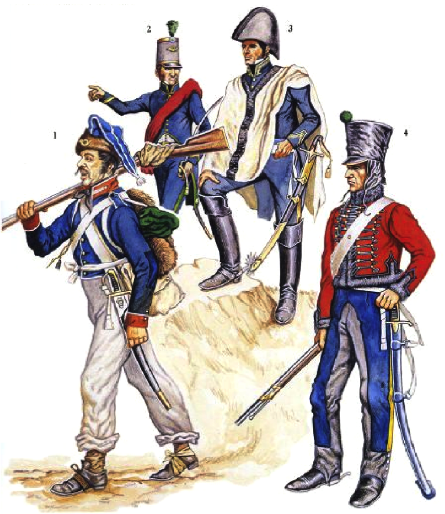 El Ejército de los Andes en 1816. 1 cazador del batallón ligero de los Andes, 2 subteniente del batallón ligero, 3 general San Martín, granadero a caballo.