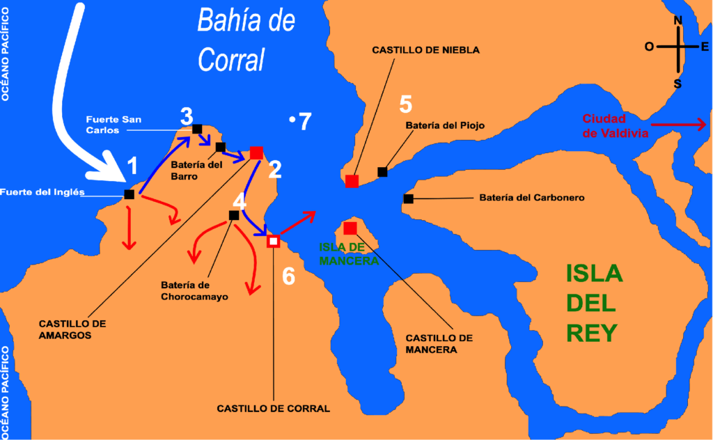 Curiosamente, los jefes del castillo del Corral (coronel Fausto del Hoyo), el de Niebla (Fernández de Bobadilla) y el de San Carlos (coronel Clemente Lantaño) se encontraban en un sarao en Valdivia, disfrutando de las bondades de tan tranquila provincia.