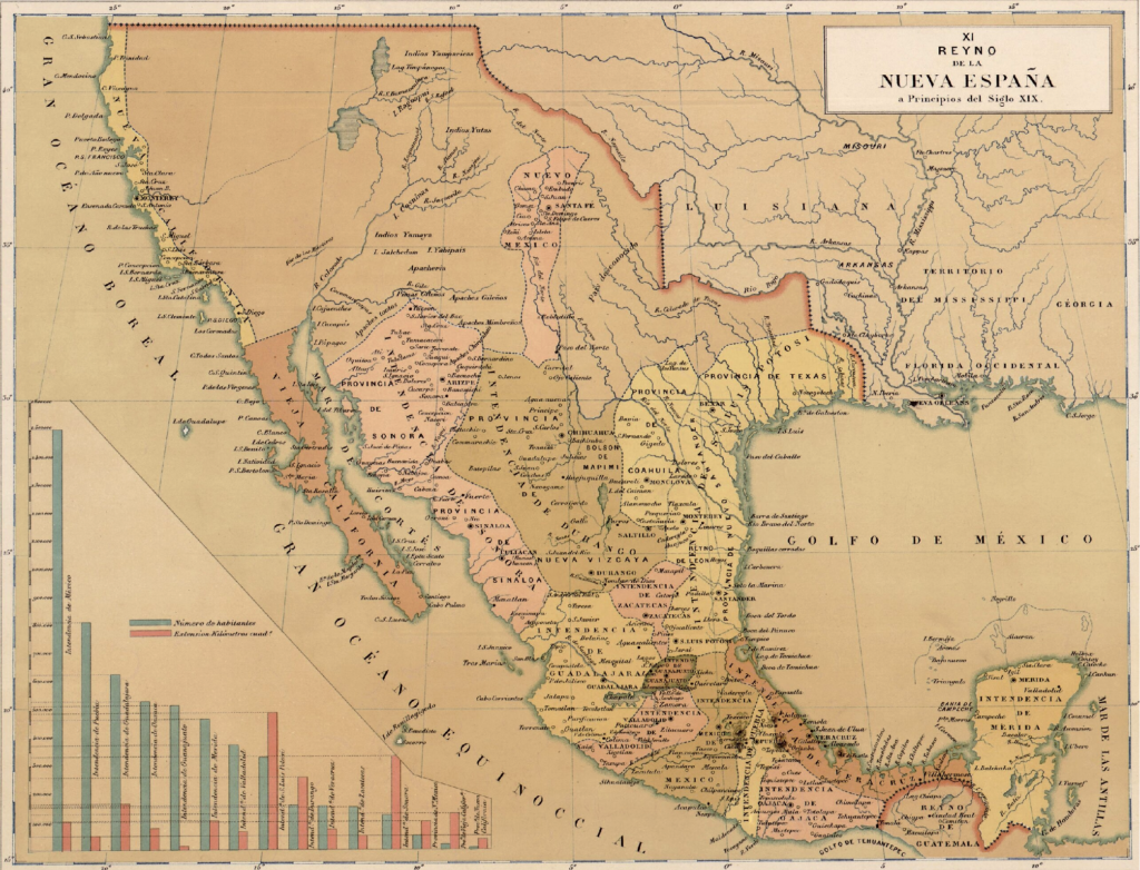 Mapa del virreinato de Nueva España a principios del siglo XIX. Compara las regiones entre el número de habitantes en azul y extensión de las provincias en rojo.