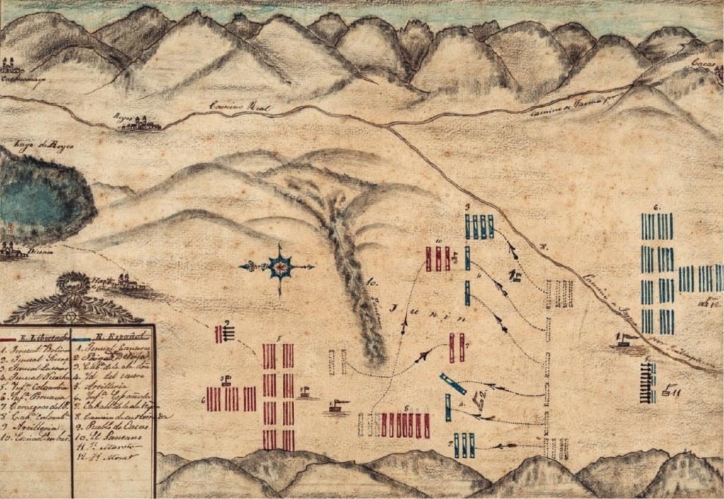 - Caballería: RC de granaderos de Colombia (2) del sargento mayor Felipe Otto Braun, EC de granaderos de los Andes del coronel Alejo Bruix y EH del Perú de Isidoro Suárez.