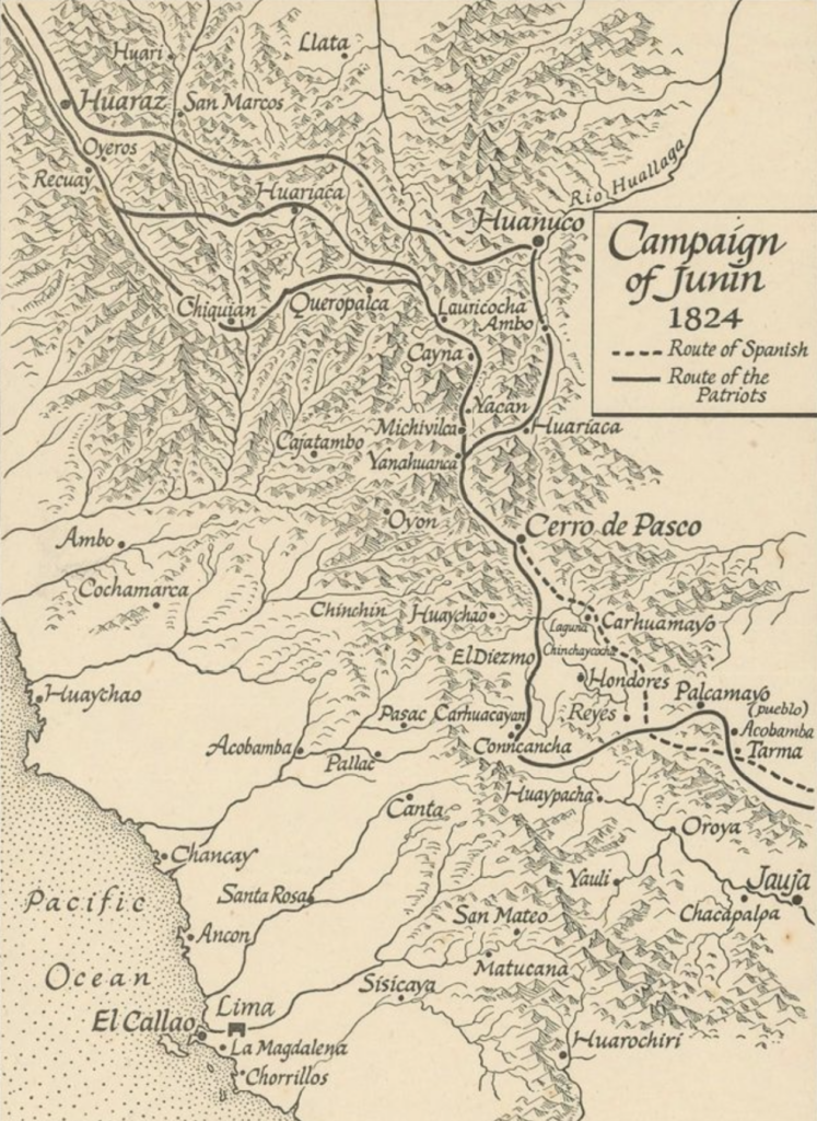 El 24 de junio de 1824, el grueso del ejército quedó concentrado en Huánuco. Desde allí el ejército fue distribuido en dos cuerpos que tomaron la ruta que pasa por Huariaca y la que conduce a Yanahuanca. Durante los primeros días de julio, alarmado por un reconocimiento que hizo Canterac hasta Cacas, Bolívar resolvió concentrar el ejército en Cayna; pero, dado que el general español no avanzó como esperaba, dispuso que la reunión se efectuara en Michivilca, en el valle del Huachar. Desde este punto avanzó a Cerro de Pasco el 1 de agosto de 1824. Al día siguiente, en Sacramento, llanura entre Rancas y Pasco, Bolívar pasó revista a sus 8.700 hombres y les arengó.