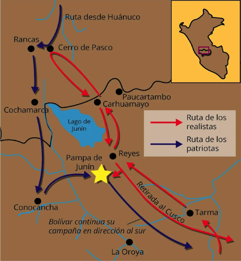 En cuanto a Bolívar su posición, hasta el momento de la concentración en Cerro de Pasco, fue: Trujillo del 7 de marzo al 12 de abril; Otuzco, donde se enteraría de la pugna entre La Serna y Olañeta, entre el 13 al 19 de abril; Santiago del 20 al 26 de abril; Huamachuco del 27 de abril al 9 de mayo; Huaraz del 10 de mayo al 17 de junio; Huánuco del 18 de junio al 6 de julio; Huariaca del 7 de julio al 27 de julio; Cerro de Pasco el 29 de julio.