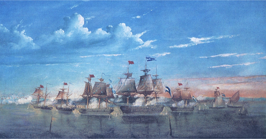 Al frente, la escuadra insurgente de 6 navíos, portando 432 toneladas, 28 cañones en su mayoría ligeros (2×24, 2×18, 2×8, 11×6 y 11×4) y 264 hombres, avanzando a la vela, sin viento a favor y con escaso calado, sin inteligencia previa y con un mando sin experiencia en el mando de una flotilla en batalla.