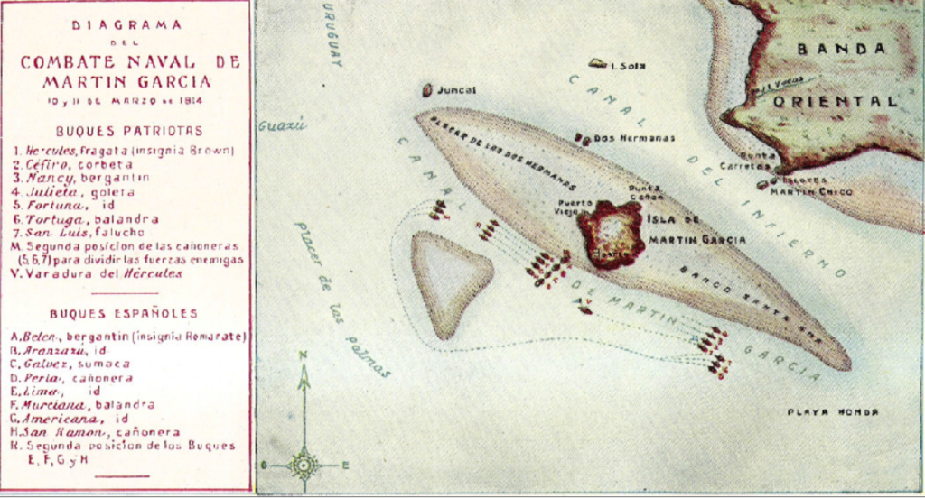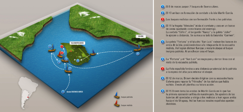 El 8 de marzo, Brown, que se encontraba frente a Colonia con la Hércules (30), la Fortuna (15), el San Luis (1) y la Carmen (5), divisó tres bergantines españoles en dirección noroeste. Los siguió hasta el anochecer, momento en que habiendo verificado que entraban al canal de Martín García y se dirigían a la isla, puso rumbo a Buenos Aires en busca de refuerzos.