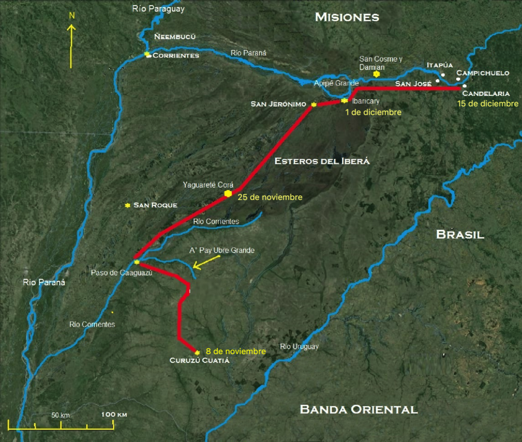 En la primera parte de la ruta, el recorrido fue casi paralelo al río Paraná, cruzando los arroyos de Las Conchas, Antonio Tomás y Feliciano. A partir del cruce de este último, al este de la actual Santa Elena, la marcha se dirigió por la línea divisoria de aguas en dirección noreste hasta las puntas del arroyo Basualdo y el río Mocoretá, hasta llegar a Curuzú Cuatiá. Esta línea de avance evitó cruzar cursos de agua, que por la época de lluvias estaban crecidos. Se facilitó así el transporte de la artillería y municiones, pese a que hubo algunas pérdidas, y la obtención de víveres sobre las costas del arroyo Feliciano y Estacas, donde existían extensas estancias pertenecientes a pobladores de la zona y/o propietarios santafesinos. La marcha se hizo en 12 jornadas seguidas, con velocidades que oscilaron entre un máximo de 44 km y un mínimo de 24 km por día, con un recorrido total de aproximadamente 450 km desde La Bajada hasta Curuzú Cuatiá.