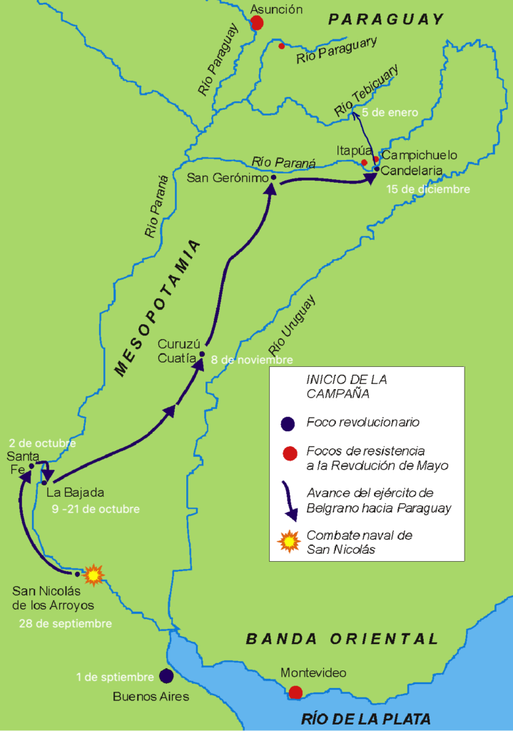 El 8 de noviembre Belgrano comunicó a la Junta su llegada al caserío de Curuzú Cuatiá con la 3.ª división, llegando dos días después la 4.ª división. Allí hizo fusilar a los dos desertores recapturados del Regimiento de caballería de la Patria. El 14 de noviembre, cuando llegaron las municiones desde Santa Fe, el ejército comenzó a moverse desde el campamento de Curuzú Cuatiá por la región del arroyo Pay Ubre. Lo hizo separado en tres divisiones comandadas por Machain, Perdriel y el propio Belgrano, quien dejaba el mando de la 3.ª división a Saturnino Saraza cuando se adelantaba a inspeccionar las otras dos. El cruce del río Corrientes, por el paso de Caaguazú, consumió tres días. El 20 de noviembre pasó la 1.ª división. Se utilizaron dos canoas y bolsas de cuero, aunque la mayoría de los soldados cruzó a nado, ahogándose dos de ellos. El día 25 pasaron por el pueblo de Yaguareté Corá (actual Concepción). Desde la ciudad de Corrientes el teniente gobernador Elías Galván envió 800 cabezas de ganado y prometió caballos que no se recibieron.