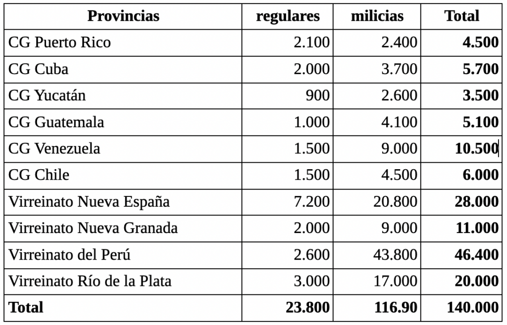 Los españoles en las tropas americanas, pues de suponer a principios del siglo XVIII más del 80 por 100, a finales apenas rebasaban el 15 por 100, mientras que los criollos superaban el 80 por 100, un cambio de gran trascendencia con vistas a lo que sucedería en 1810: en 1800, de los 35.000 efectivos del Ejército de Dotación solamente 5.500 eran peninsulares, lo que parece indicar que no dieron resultado las disposiciones sobre la leva peninsular expedidas por la administración colonial, por lo que el orden colonial parecía sustentado por las élites criollas y por la misma administración colonial, continuando una política que favorecía a ambos.