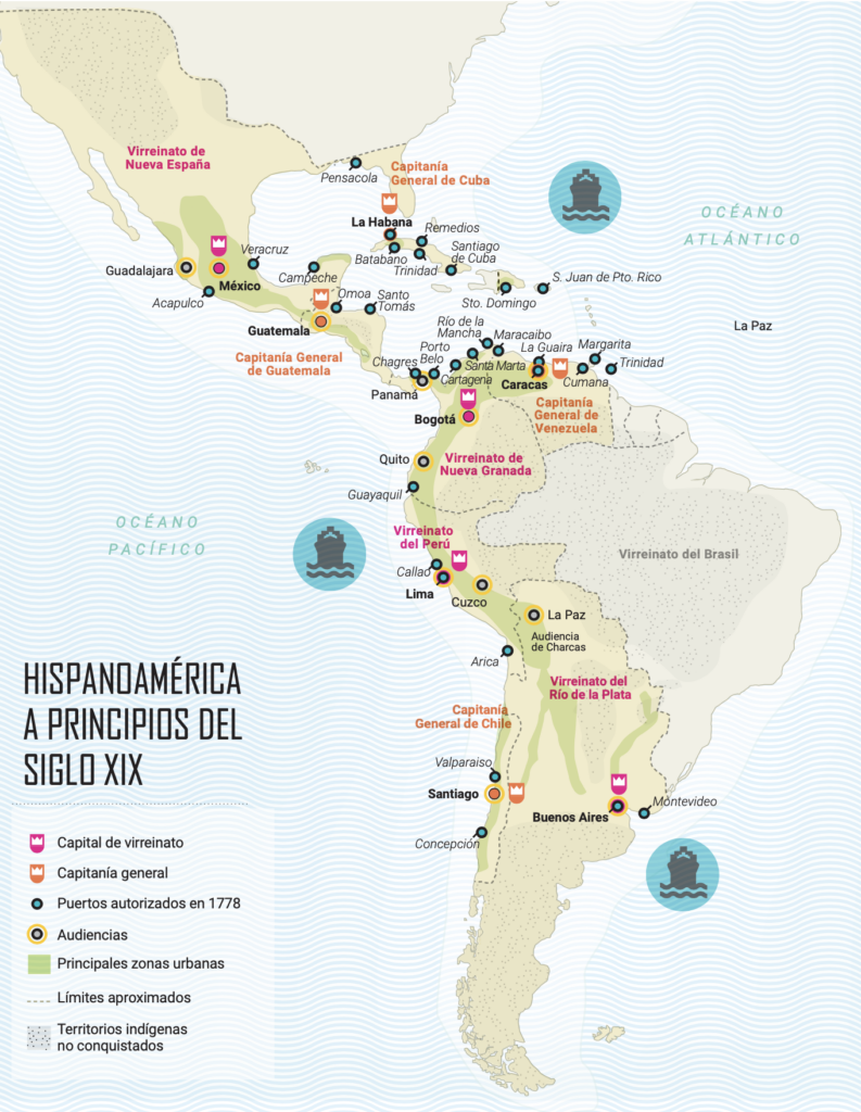 Organización de Hispanoamérica a principios del siglo XIX con indicación de virreinatos y capitanías generales.